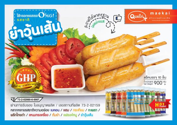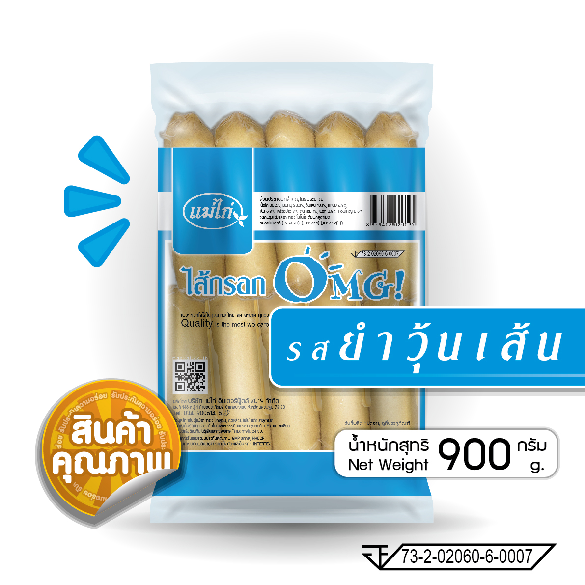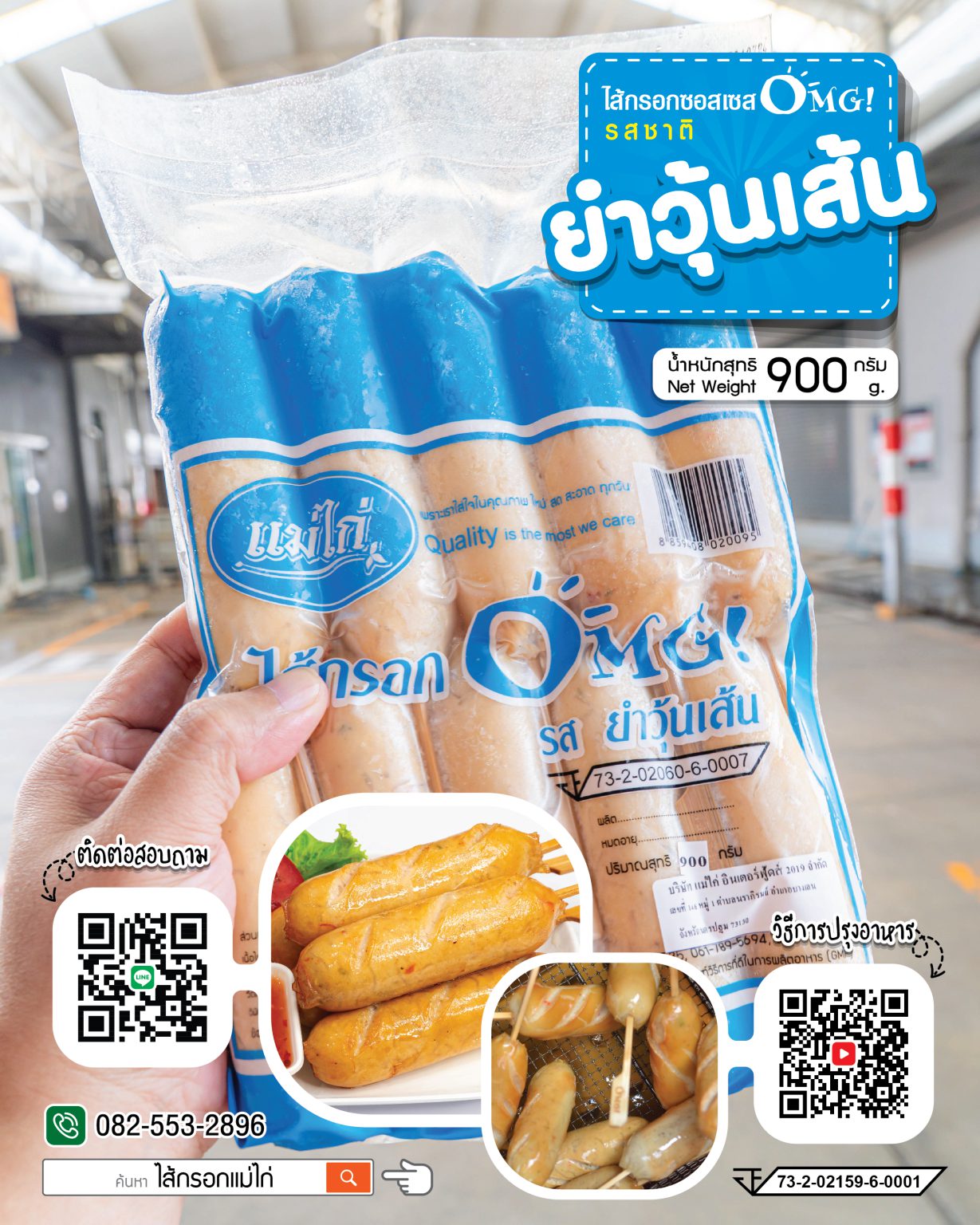 ไส้กรอกOMG ตราแม่ไก่ เสียบไม้ละ 1 ลูก จำนวน 10 ไม้ น้ำหนัก 900 กรัม/แพ็ค
