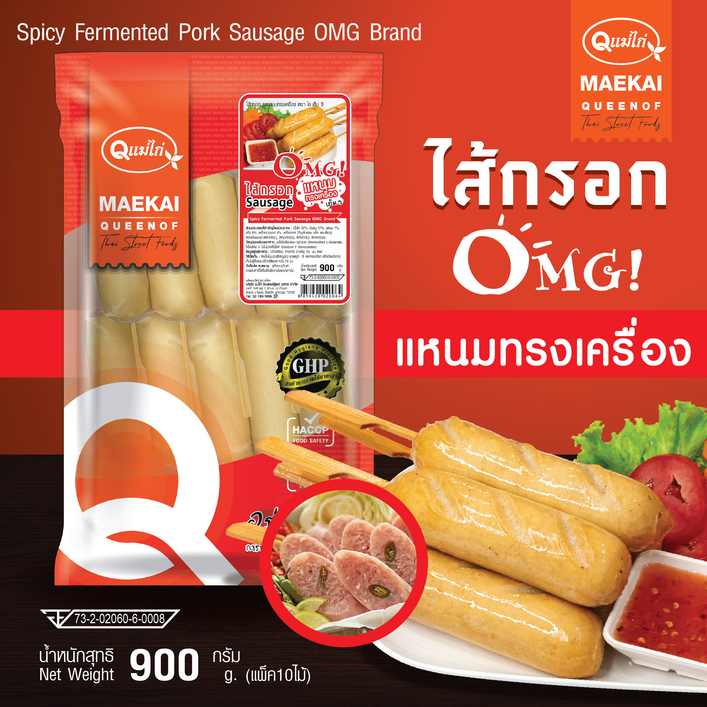ไส้กรอกOMG ตราแม่ไก่ เสียบไม้ละ 1 ลูก จำนวน 10 ไม้ น้ำหนัก 900 กรัม/แพ็ค