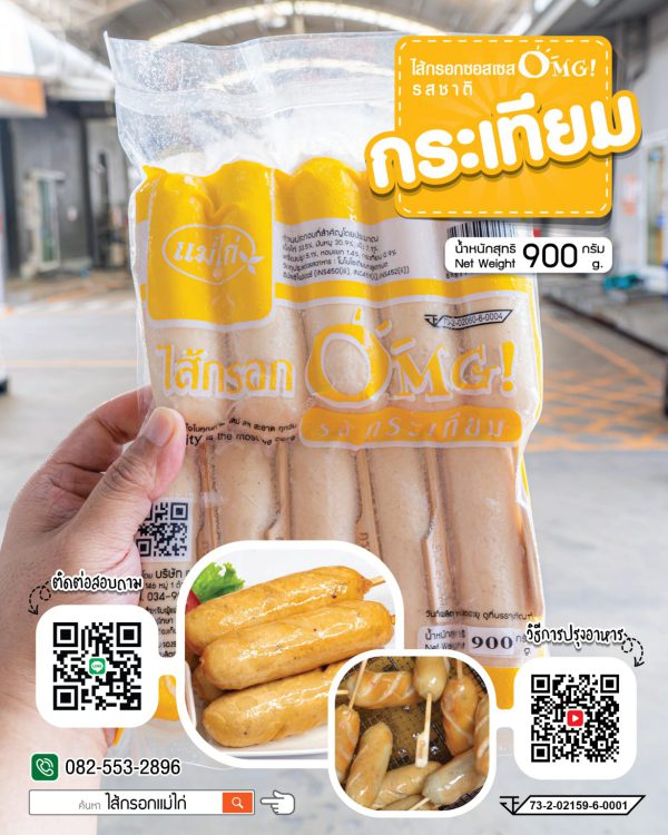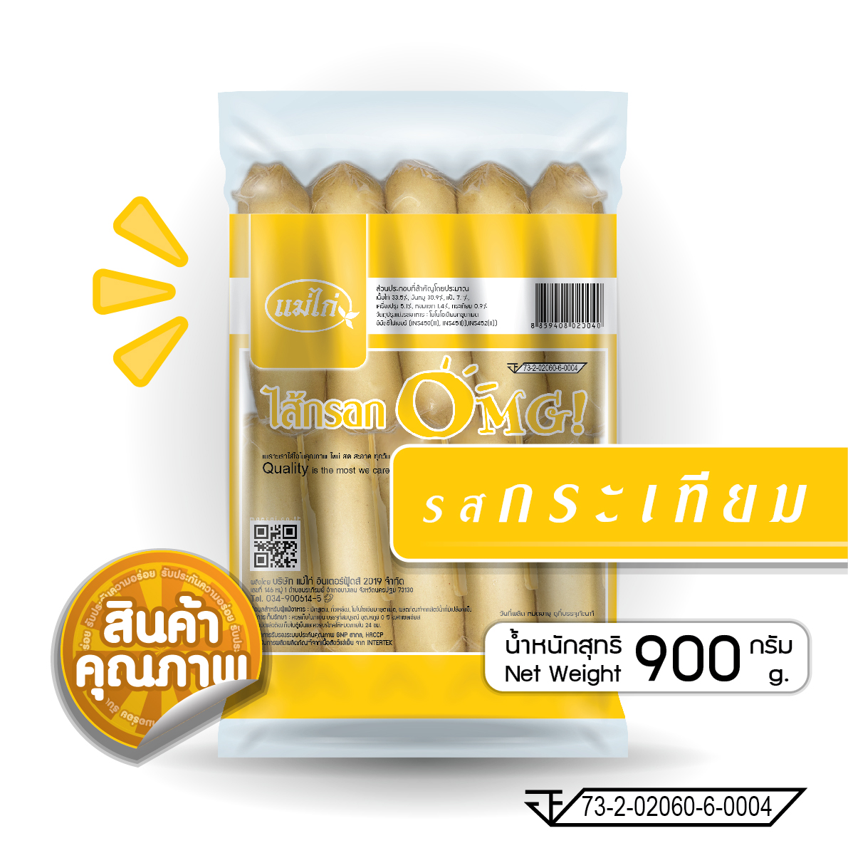 ไส้กรอกOMG ตราแม่ไก่ เสียบไม้ละ 1 ลูก จำนวน 10 ไม้ น้ำหนัก 900 กรัม/แพ็ค