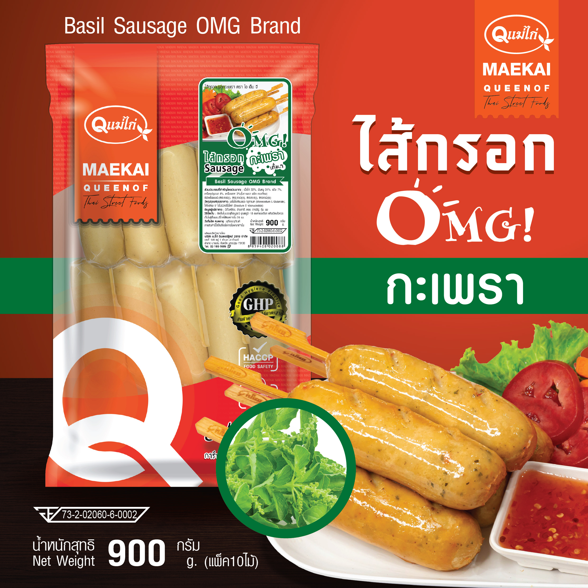 ไส้กรอกOMG ตราแม่ไก่ เสียบไม้ละ 1 ลูก จำนวน 10 ไม้ น้ำหนัก 900 กรัม/แพ็ค